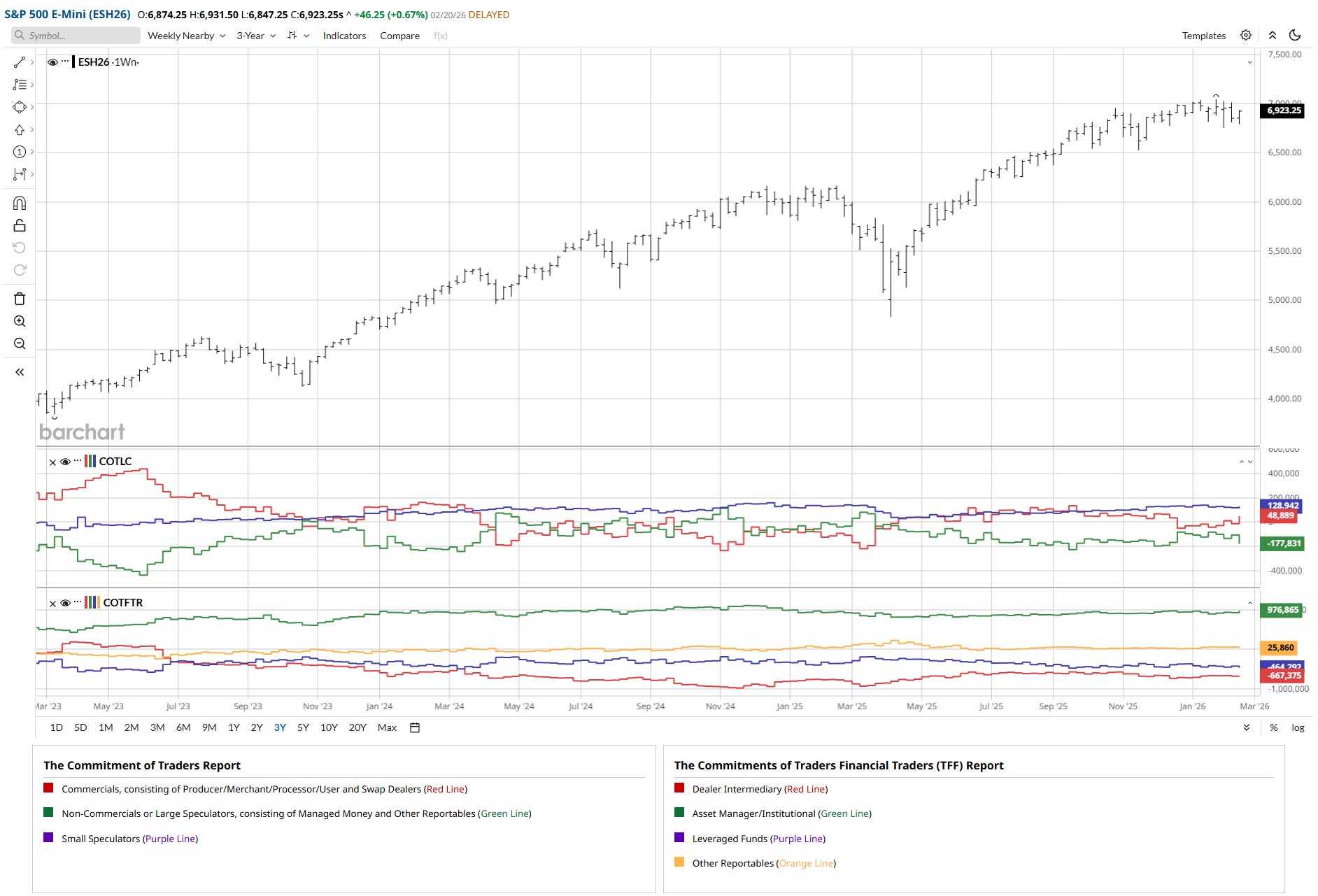 What makes the futures picture especially interesting is how positioning has shifted. Commitment of Traders data as of February 17 show commercials running very large gross positions on both sides, with over 1.44 million contracts long and 1.40 million short. Asset managers, a subset of that commercial bucket, have leaned net long with more than 1.16 million longs against about 183,000 shorts, adding over 50,000 long contracts week‑over‑week. Non‑commercial traders, by contrast, are significantly net short, with around 196,000 longs against 374,000 shorts. In plain English, real‑money institutions are still using equity futures as their primary way to express bullish exposure, while speculators have been fading the rally. That kind of split is exactly what you want to see if you’re looking for a market that can climb a wall of worry: the people who matter for trend are adding, while fast money is giving you fuel for squeezes on every upside surprise.