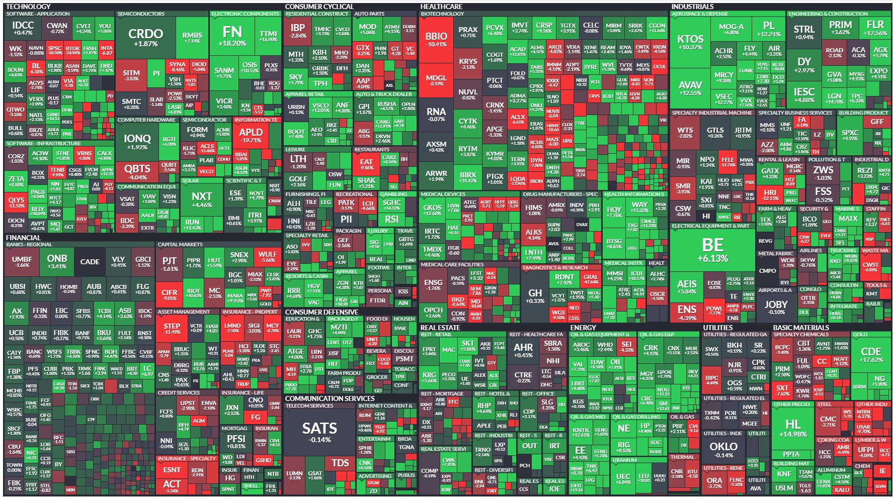 Real estate leaders such as MAC, KW, JLL, CUZ and COLD mirror the IO tilt into REITs with specific demand stories, while losers like WY, AMH, INVN and BNL skew toward more generic property exposure. Small‑cap leaders – VB, RYLD, SCHA, FNDA and AVUV – are diversified and value‑tilted; losers like CALF, SDVY, SPSM and IWO are more growth‑ and dividend‑factor slices that have been fading. And in technology, RNG, RELY, AERH, GPN, AXTl and FN lead with payments, comms and niche hardware, while KLAR, SPSC, FROG, APLD, VELO and OLED show up as losers – exactly the kind of higher‑multiple software and specialty hardware names that de‑rate first when rates stay sticky.