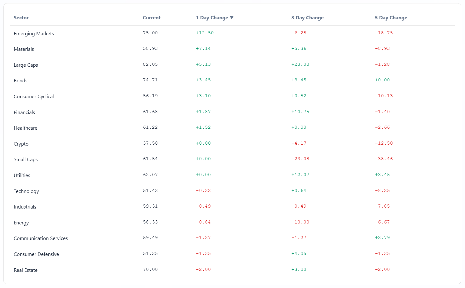 The sector sentiment panel makes that distribution clear. Large caps, emerging markets, bonds, real estate, utilities, financials, and small caps are all above the 60 mark on their current readings, with large caps north of 82 and emerging markets right around 75. That is a wide base of constructive signals across styles and geographies. Lower down the stack, healthcare, communication services, industrials, materials, energy, consumer cyclicals, technology, consumer defensives, and crypto cluster between the high 30s and upper 50s. None of those are washed‑out; they are more “debated” than “abandoned.” When you zoom into the sector‑delta table, you see big 5‑day drops in small caps, consumer cyclicals, technology, and crypto, while materials, utilities, and communication services are either flat or modestly lower over the same window. Taken together, the message is that the market hasn’t flipped bearish, but it has been rotating away from the high‑beta growth complex into more stable, cash‑flow‑heavy areas.