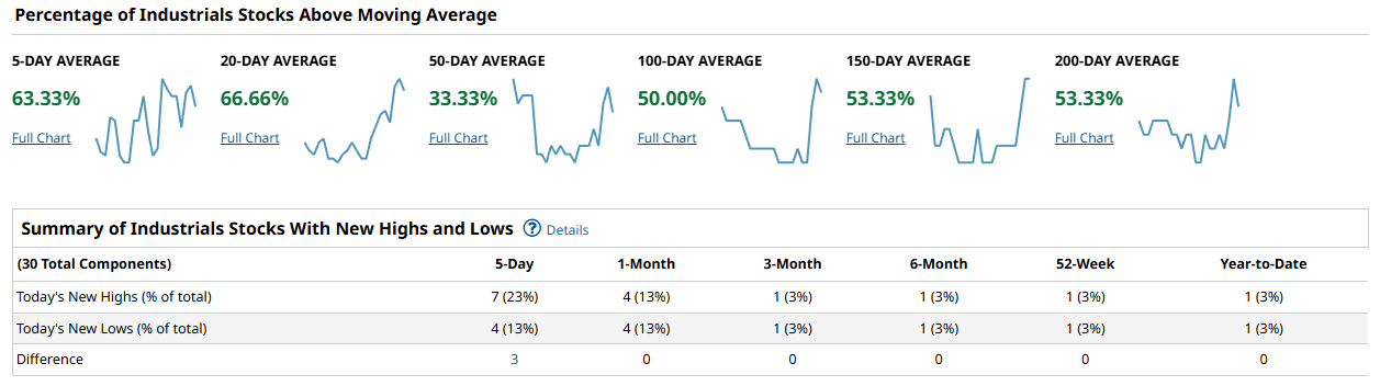 The Dow Industrials tell a simpler story, partly because the sample is only 30 names. The 5-day reading of 63.33% and 20-day of 66.66% look fine, but the 50-day is just 33.33% -- one in three Dow components above their 50-day moving average.