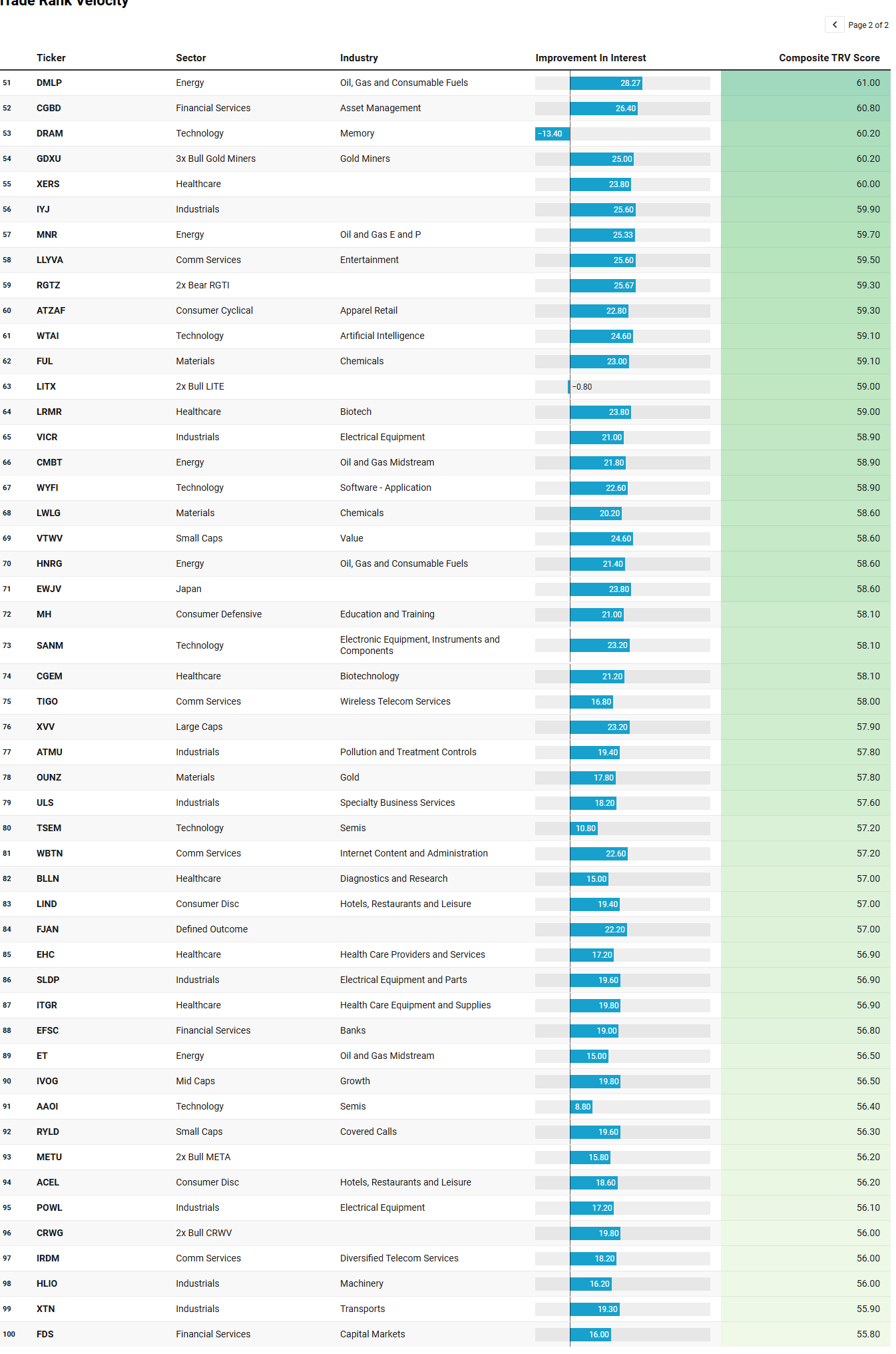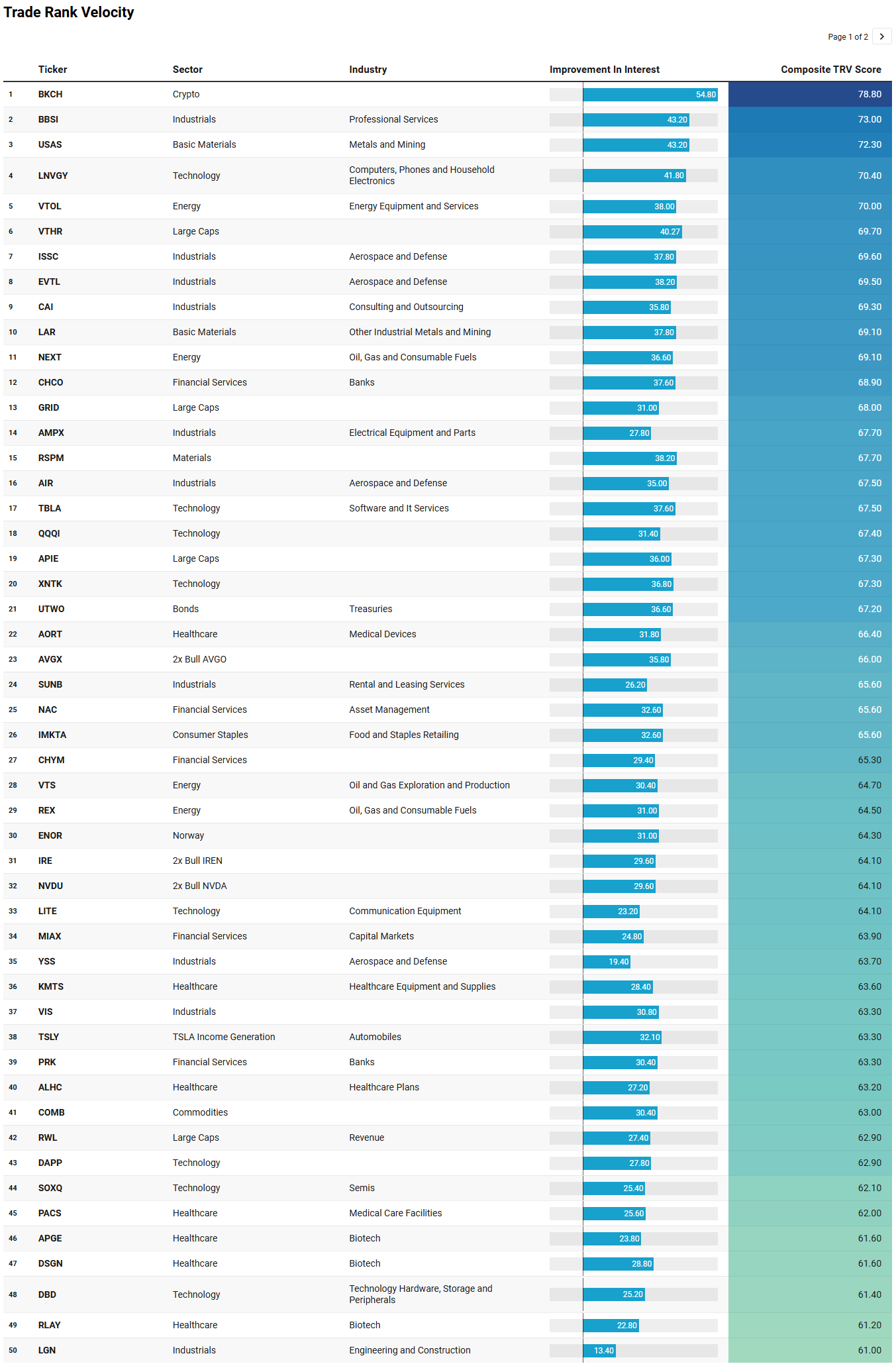 TRV is a proprietary metric that measures the recent acceleration or deceleration in institutional trading activity for a given stock by comparing its average trade rank over the past few days to its average in recent weeks. A sharp improvement in TRV typically reflects a notable shift in positioning, often accompanied by sustained trade activity, suggesting institutions are actively engaging with the name and that intensity of activity is rising. This often precludes meaningful price or narrative shifts. This isn’t a buy-list or sell-list; it’s meant to draw your eyes to names where institutions are putting money to work.