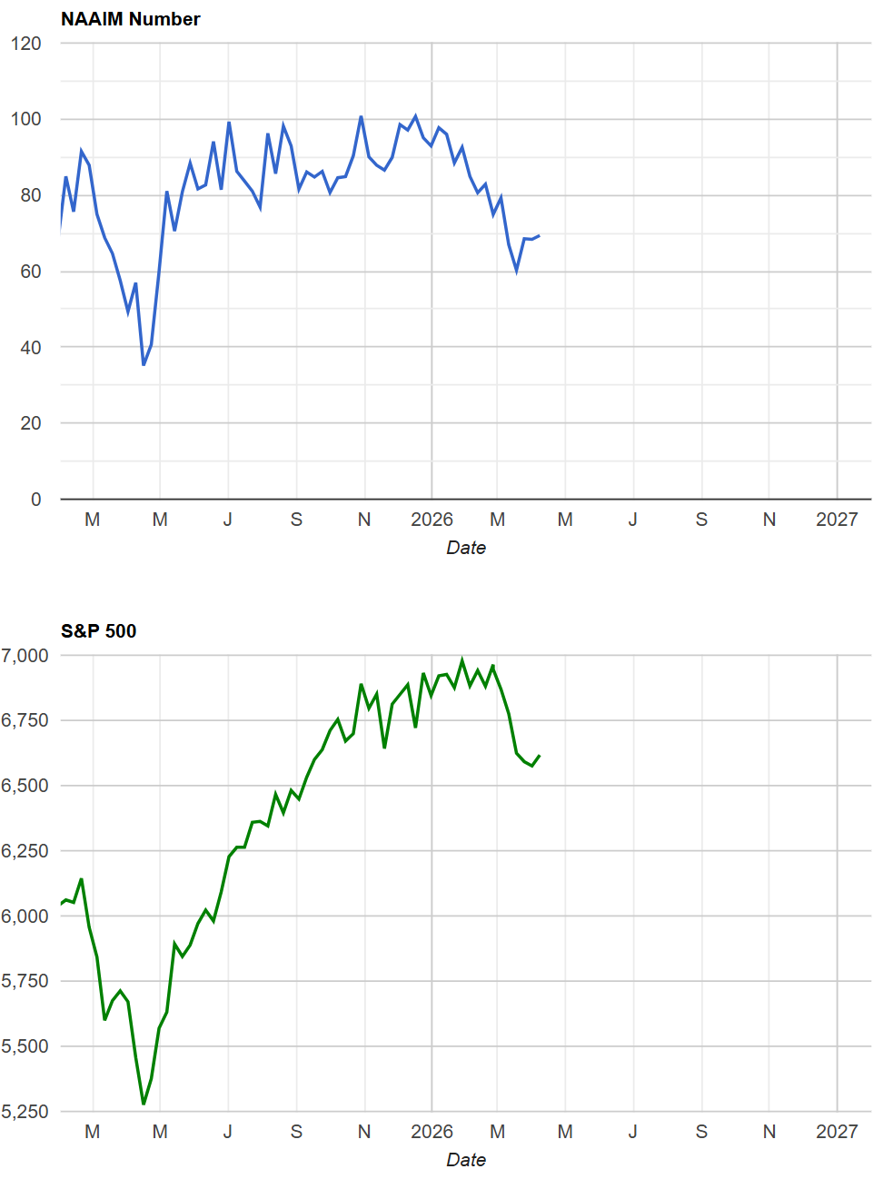 The NAAIM Exposure Index posted 69.38 for the week of April 8, a marginal uptick from 68.36 the prior week and essentially flat versus 68.52 on March 25. Active managers have been parked in the high-60s for three consecutive weeks after climbing off the 60.24 low registered on March 18. Compared to the Q1 average of 82.00, this represents a meaningful de-risking -- managers have shed more than twelve points of exposure since the start of the year.