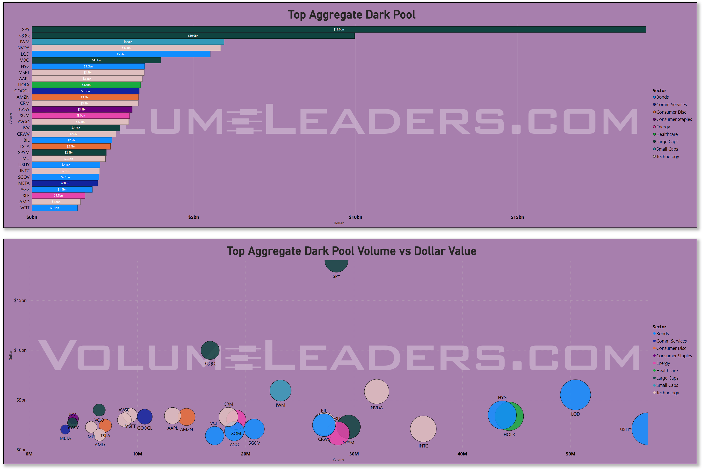 The dark pool lens adds texture to what was visible on the lit tape. SPY again dominated at approximately $16 billion, but the composition beneath it shifted. QQQ at $10 billion, IWM at $5 billion, and LQD at $5 billion appeared together in a way that tells you institutions were not just buying equity exposure -- they were also expressing views on credit and duration simultaneously. LQD and HYG both registering significant dark pool dollar flows, with HYG at roughly $3.8 billion and USHY appearing in the volume-versus-dollar scatter with high share volume relative to dollars, is consistent with the post-ceasefire credit relief trade: as geopolitical risk premia compressed in the bond market, institutional buyers quietly accumulated investment-grade and high-yield exposure in size through off-exchange venues where price impact is minimized. HOLX at $1.4 billion in dark pool dollars stood out as the lone healthcare name with meaningful hidden flow, which is notable given that healthcare remained one of the weaker sectors by participation metrics -- a divergence perhaps not worth watching since HOLX was taken private and stopped trading on the Nasdaq on April 6th.