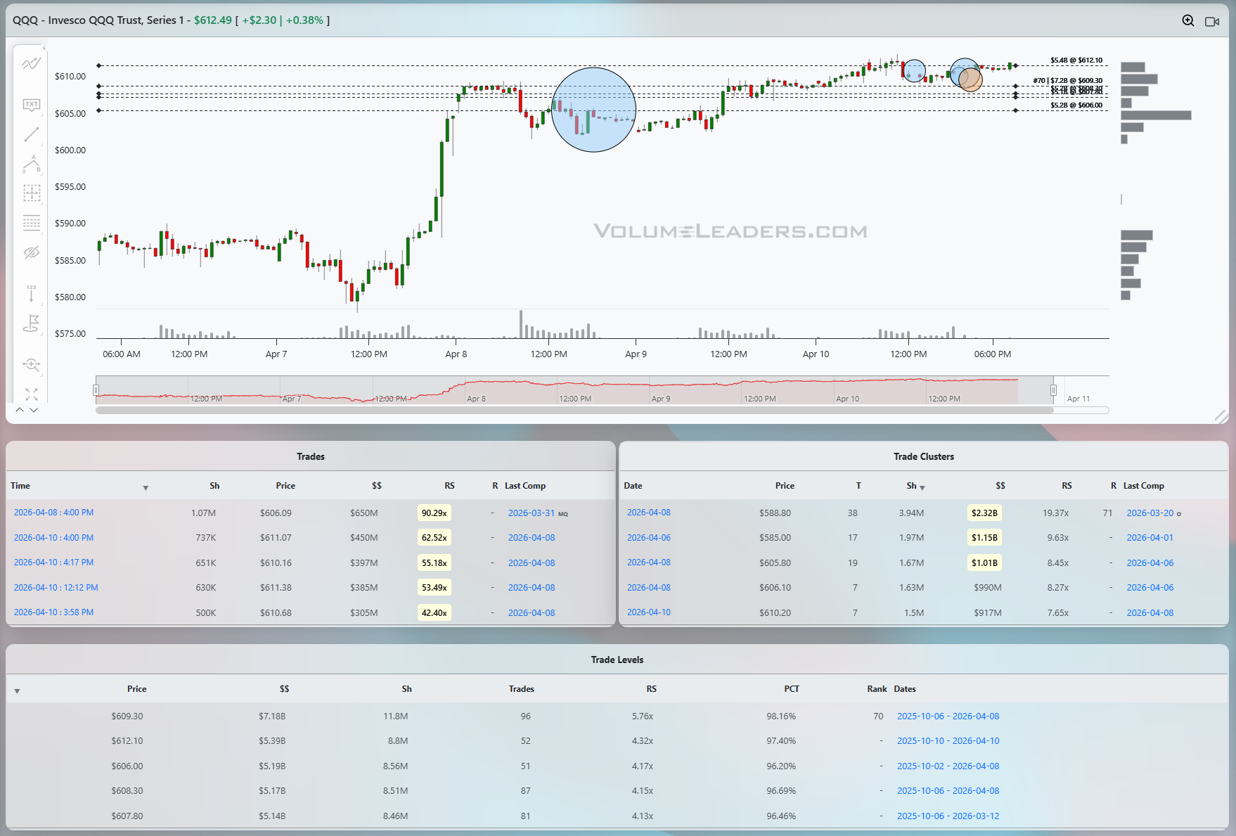 QQQ layered in its own complexity. The $609.30 level at $7.18 billion and rank 70 -- the 70th largest level in QQQ's history -- is the structural anchor. The $2.32 billion cluster at $588.80 with a rank of 71 is the floor of floors, dating back to March 20. The current price at $612.49 is hovering above the $612.10 level at $5.39 billion and 97.40% PCT, which is also rank 52 historically -- so QQQ is sitting right on top of a top-100 all-time level. That is the line of scrimmage. The April 8 close print of $650 million at $606.09 with a 90.29x relative size was the institutional anchor for the ceasefire move. The cluster accumulation at $605.80 and $606.10, each carrying approximately $1 billion, marks the first meaningful support below current price. A flush back through $609 without a macro catalyst would be concerning; rejection at $612.10 with diminishing volume would be the tell that the level is defending. Above $612.10, the $608.30 and $607.80 levels become support and the path opens toward $615 and beyond.