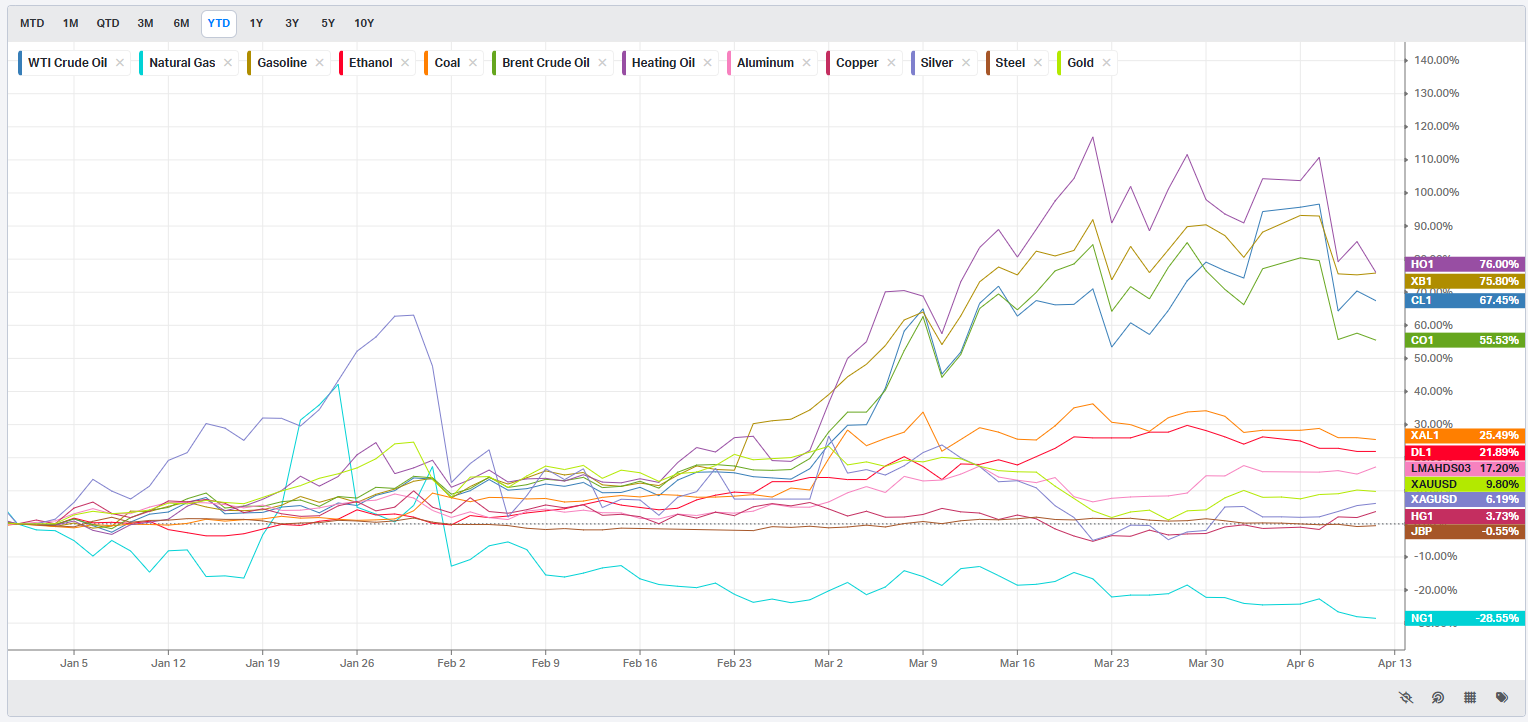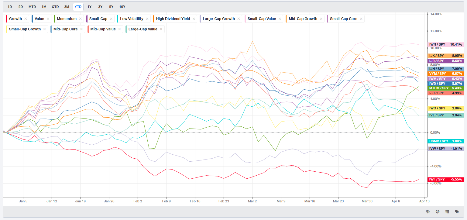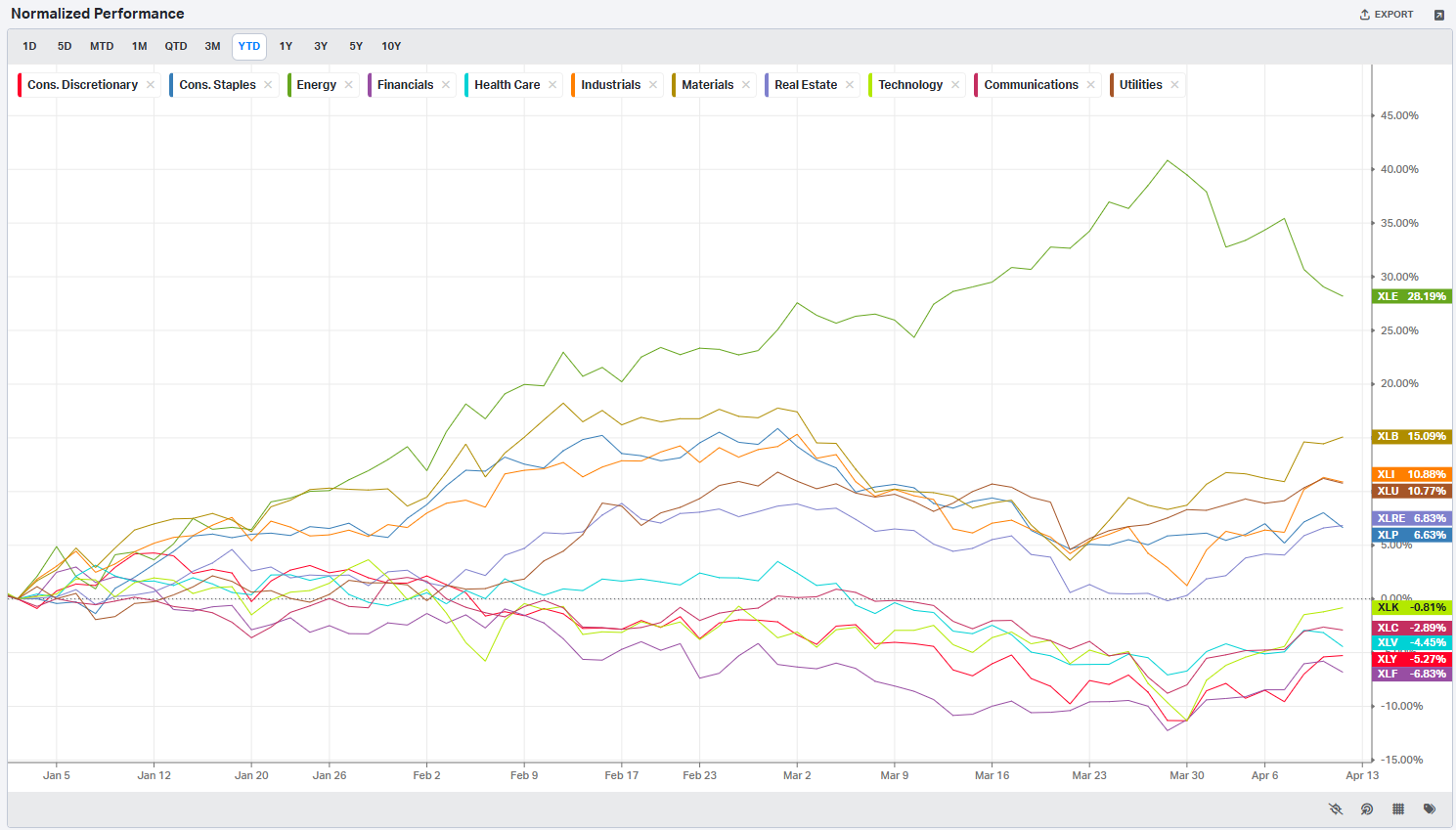 The only sector in negative territory for the week was energy. This too is exactly what one would expect from a -16% oil move. The inversion is worth noting: the macro trade that saved the broad market hurt the one sector that had been an earnings bright spot during the conflict period. As corporate estimates get revised heading into Q1 earnings season -- with bank earnings beginning the week of April 14 -- energy will likely be a relative gainer on revisions while most other sectors face downward pressure from the oil-induced cost surge earlier in the quarter.