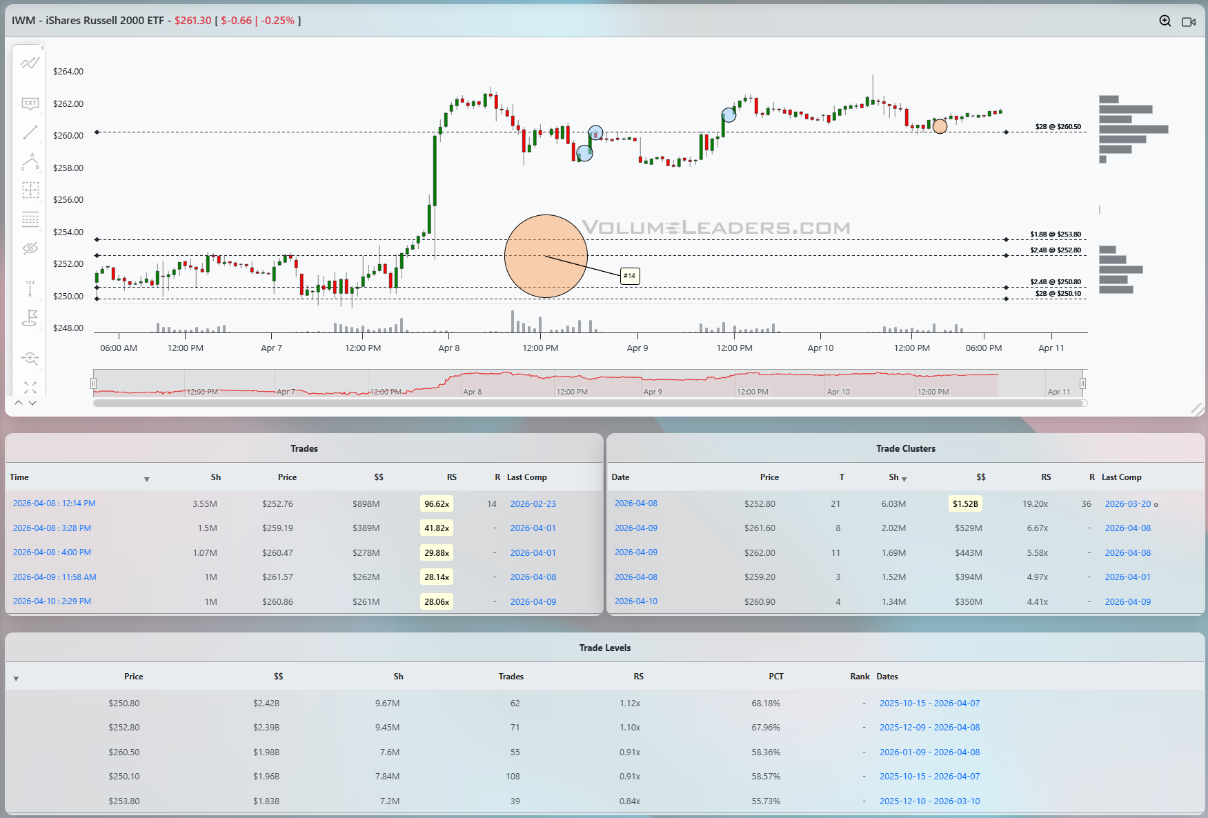 IWM carries the week's most significant historical print. The #14 ranked trade in IWM's entire history printed on April 8 at $252.76, carrying $898 million at a relative size of 96.62x. That print landed at the base of the ceasefire impulse, exactly at the $252.80 level that carries $2.39 billion notional and a 67.96% PCT. The $250.80 level at $2.42 billion and the $250.10 at $1.96 billion stack just below, creating a dense support shelf in the $250 to $253 zone that is now the most institutionally established area in IWM. The ceasefire impulse took price from that zone to $262, establishing the $260.50 level at $1.98 billion as the current ceiling -- visible on the chart as the dashed line price is hovering just above. IWM closed at $261.30, above the $260.50 level but below the $262 cluster region. The line is thinner here than in SPY or QQQ: acceptance above $262 with follow-through would signal small-cap leadership and confirm the risk-on recovery is broadening. A slide back through $260.50 and then $259.20 -- where the $389 million cluster print landed on April 8 -- would indicate the IWM move is stalling at resistance and the heavy base near $252 becomes the next magnet.