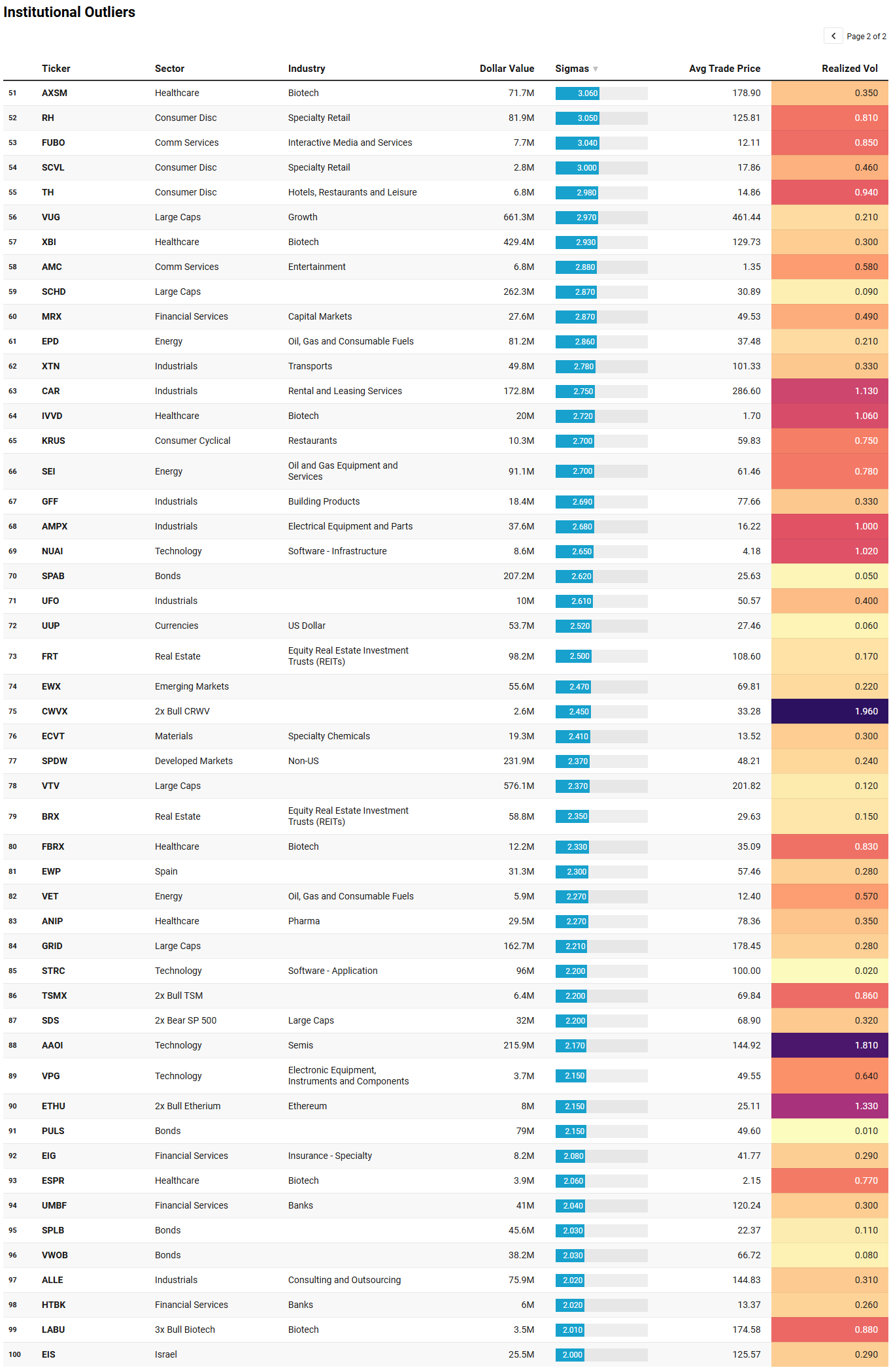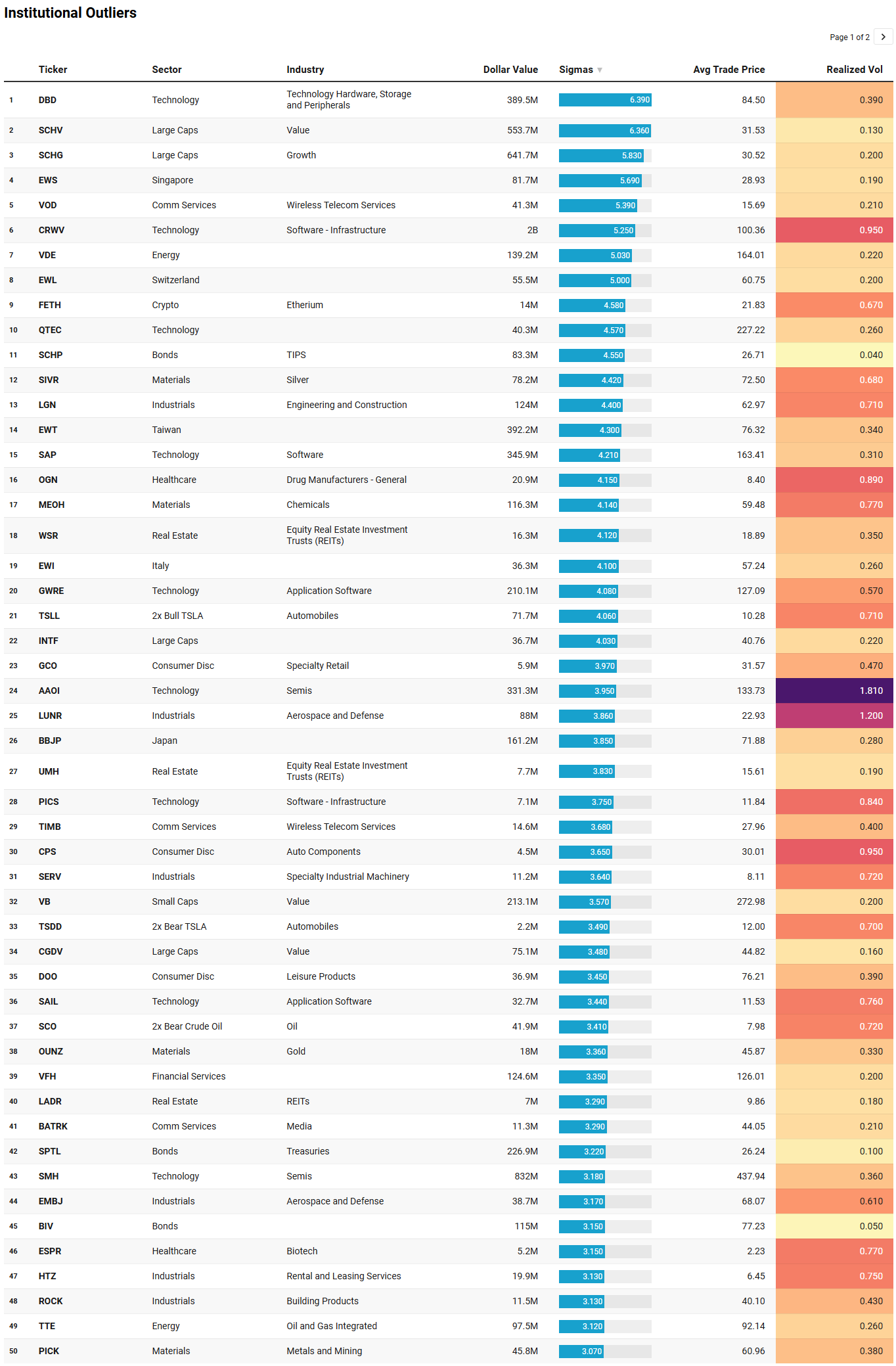 The institutional outlier list is dense with signals, and read alongside the flow narrative from earlier in the week it sharpens several themes considerably while introducing a few that were not visible in the aggregate dollar data at all.