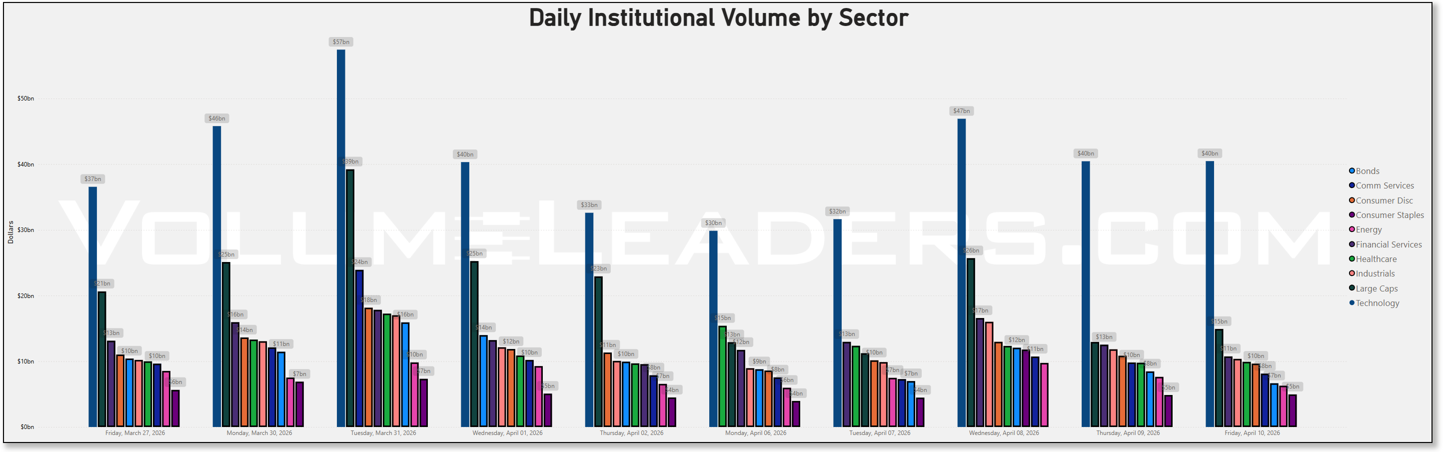 Against that backdrop, the daily institutional volume table tells the week’s story in chapters. The Monday through Wednesday window of March 30 through April 1 saw aggregate dollar volumes running hot across financials, technology, and large caps, with technology alone registering $57 billion on Tuesday March 31 and $45 billion Wednesday April 1. That pace was not maintained. By Thursday April 2 tech dropped to $32 billion, and the following Monday and Tuesday -- April 6 and 7 -- saw technology volumes pull back further to the high $20s and low $30s. Then the week that matters arrived. Wednesday April 8 saw technology reaccelerate to $46 billion, the second highest print of the entire two-week lookback. Thursday April 9 moderated slightly to $40 billion, and Friday April 10 settled in the low $40s. The April 8 and 9 surge in technology volume coincided precisely with a broader institutional response to the geopolitical relief trade and the ongoing earnings positioning cycle ahead of the TSMC report scheduled for April 16, where analysts at expect revenue of $35.47 billion and consensus EPS of $3.26 -- numbers already confirmed as likely beatable given TSMC’s March revenue data showing a 45.2% year-on-year gain. Financials followed a similar arc, running heavy in the $16 to $18 billion range midweek before moderating Friday, consistent with institutional pre-positioning ahead of the bank earnings week beginning April 14 with JPMorgan, Citi, Goldman, and Wells Fargo.