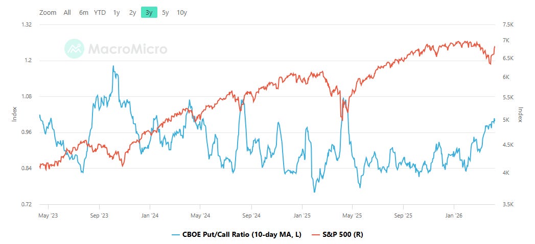 The current level is sitting right on the border of elevated anxiety. From a contrarian lens, sustained readings at or above 1.00 have historically coincided with the later stages of drawdowns rather than the beginning -- the hedging has already been done, which tends to limit further downside depth and improve the quality of the eventual bounce. The tripwire here is direction: if the 10-day average begins rolling below 0.95, it would indicate the hedging impulse is receding and risk appetite is returning, a constructive signal. A fresh push above 1.05 would suggest a new wave of fear is arriving and the drawdown has further to run.