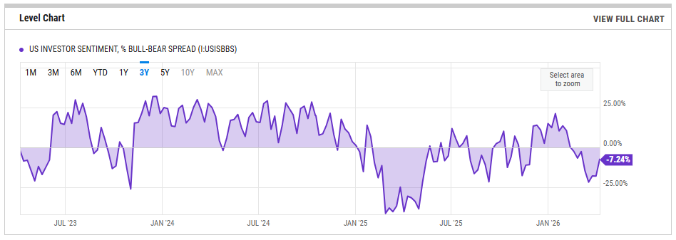 Context matters: the long-term average sits near +6.29%, and this reading stood at -40.16% one year ago during last spring's washout, so current pessimism is moderate rather than extreme. The sub-zero reading remains contrarian-supportive for equities; historically, sustained prints below zero have preceded tradeable rallies once price stabilizes. A continued march back toward zero and then into positive single digits would confirm the sentiment unwind is genuine. The tripwire to watch on the upside is a move above +20, the level hit in mid-January, which marked the crowded-optimism ceiling before this entire leg lower began. On the downside, any fresh deterioration back below -15 without an accompanying price catalyst would suggest the recovery in sentiment is fragile and vulnerable to another liquidation wave.