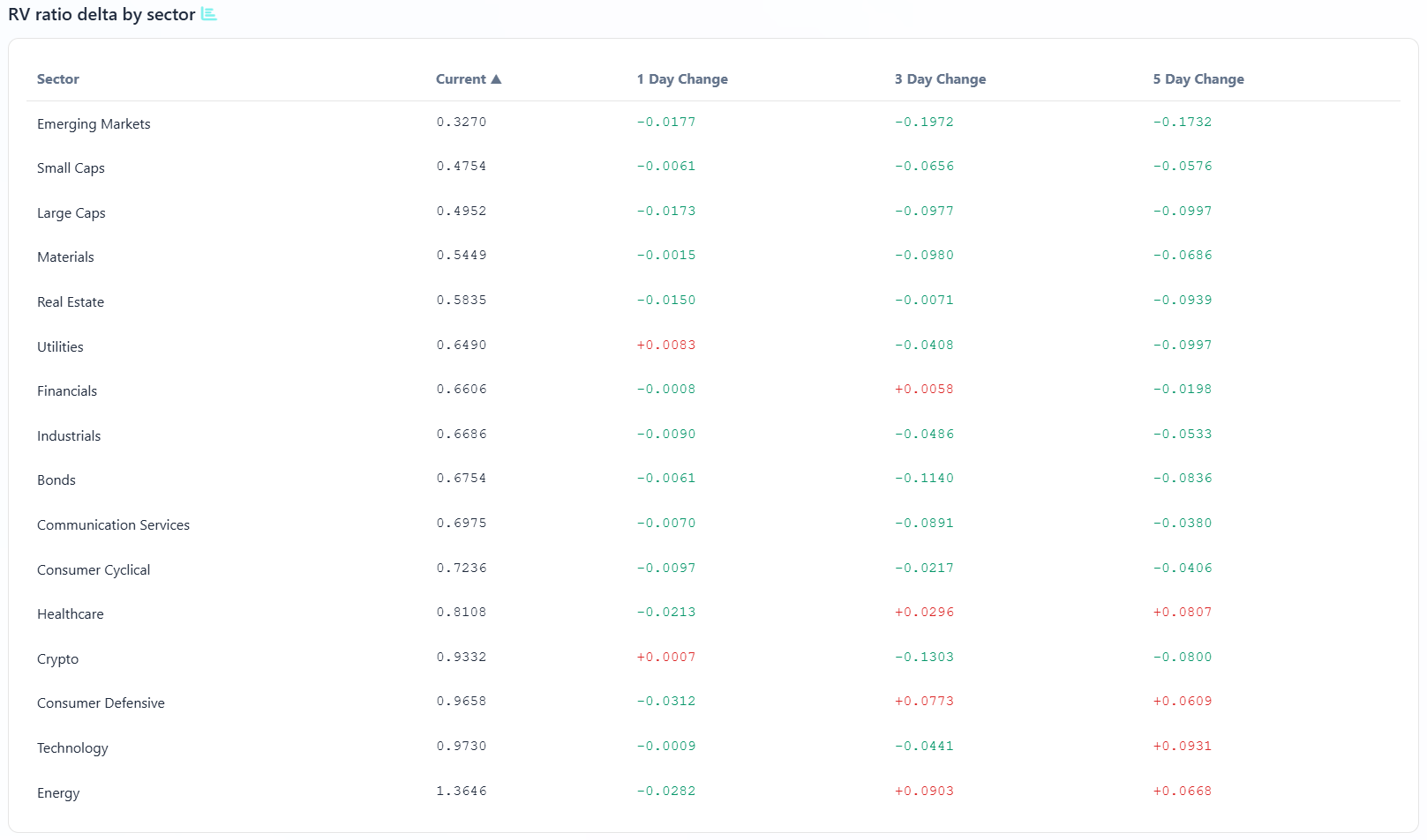 EEM -- 8%: The broadest emerging markets vehicle and the top-ranked name in the EM sector leaders column at 1.0339. With a participation rate above 93% and improving relative strength versus SPY, EEM provides the sleeve anchor. The backdrop data showed EM with the lowest volatility ratio of any sector at 0.33 and still improving -- meaning upside volatility is dramatically outpacing downside volatility, the most favorable RV configuration in the entire dashboard.