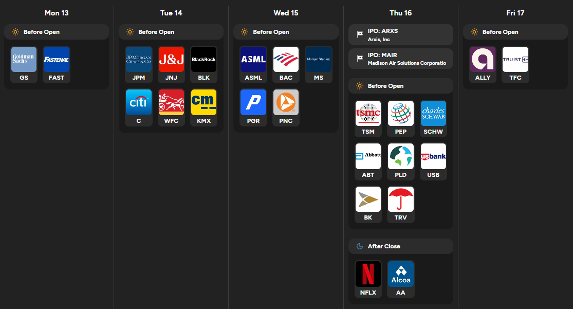 The earnings calendar is front-loaded with financials and carries a strong macro read-through for the entire week. Goldman Sachs and Fastenal open Monday; GS trading revenues and net interest margin guidance will set the tone for broker-dealer sentiment into a heavy slate. Tuesday brings JPMorgan, J&J, BlackRock, Citi, Wells Fargo, and CarMax -- the most consequential morning of the season. JPM's net interest income guidance and credit-card delinquency commentary will function as a consumer-health proxy; BlackRock's AUM flows will confirm or deny whether the institutional risk-off impulse that dominated March is reversing. Wednesday adds ASML, Bank of America, Morgan Stanley, Progressive, and PNC; ASML's order book is the key semiconductor demand signal, and any commentary around AI-driven equipment spending would ripple into the chip supply chain. Thursday is headlined by TSMC before the open -- its capacity utilization and leading-edge node revenue are the most important semiconductor data points of the quarter -- followed by Pepsi, Charles Schwab, Abbott, Prologis, US Bancorp, Bank of New York Mellon, and Travelers. Netflix and Alcoa report after Thursday's close; Netflix subscriber growth in a consumer stress environment and Alcoa's realized aluminum pricing under tariff pressure are both worth watching. Ally Financial and Truist round out Friday before the open. Two IPOs are slated for Thursday: Arxis Inc and Madison Air Solutions Corporation, both likely to gauge risk appetite for mid-market industrial names in a volatile tape.