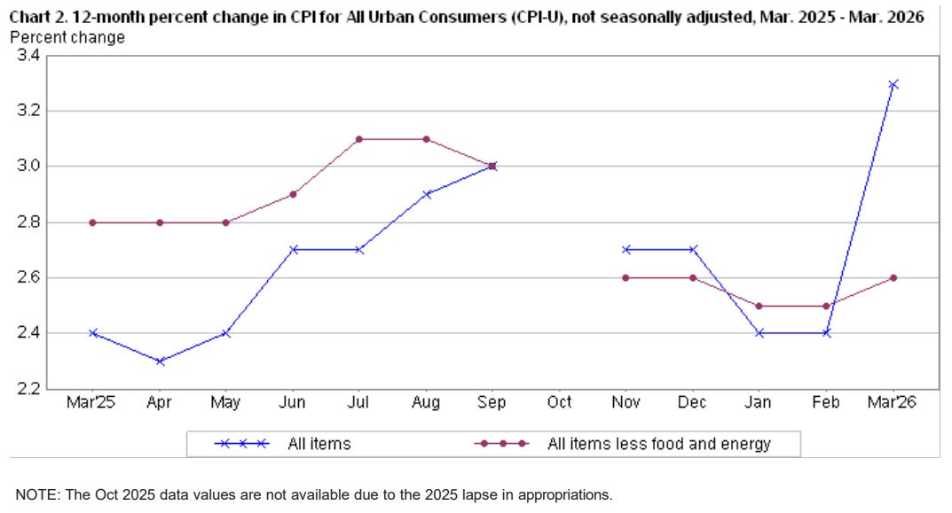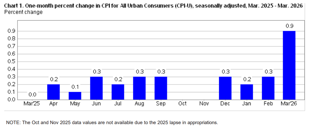 Friday’s March CPI report delivered what most sophisticated participants expected but hoped to avoid seeing in print. Headline CPI rose +0.9% month-over-month -- the largest monthly gain since June 2022 -- pushing the year-over-year rate to +3.3%, up sharply from 2.4% in February and the fastest pace since May 2024. The culprit was obvious: energy prices surged +10.9% for the month, retail gasoline climbed +18.9% year-over-year, and the national average gasoline price hit $4.12 per gallon -- the first time above $4 since 2022. Airfare jumped +14.9% year-over-year.