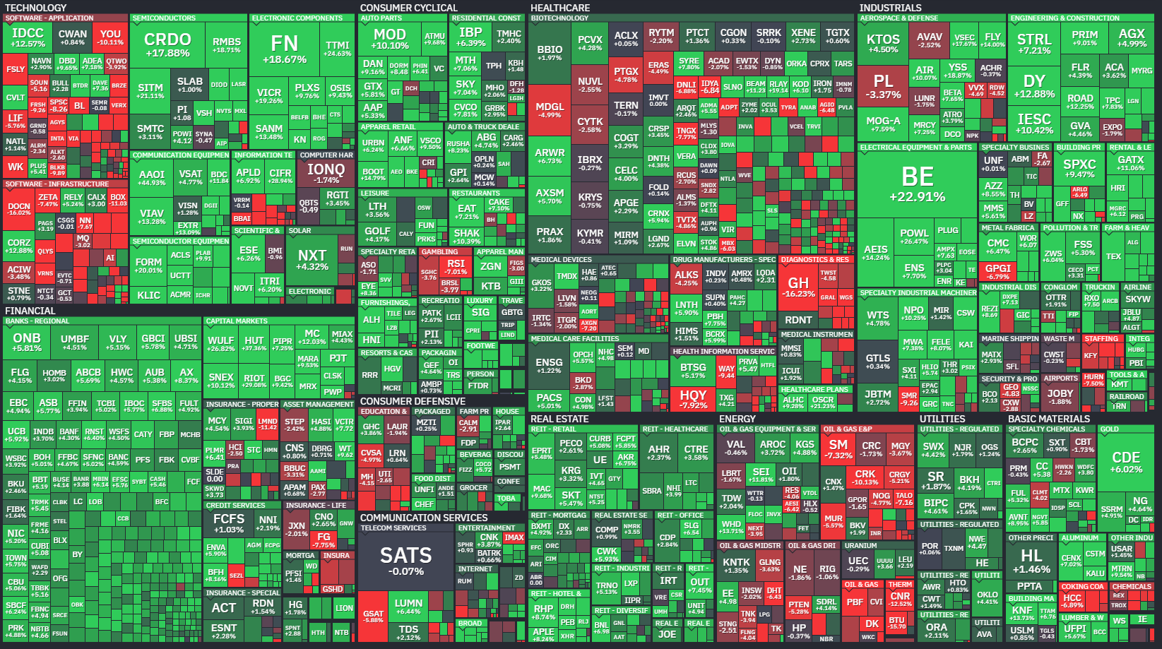 New high/new low differentials are robustly positive on every lookback: +249 on 5-day, +261 on 1-month, +59 on 3-month, +49 on 6-month, +45 on 52-week, and +56 year-to-date. The RUT heatmap is a mess of green and red at the individual stock level -- the usual small-cap chaos -- but the aggregate signal is unambiguous: small-cap participation is broader and more durable than anything the mega-cap dominated indices are showing.