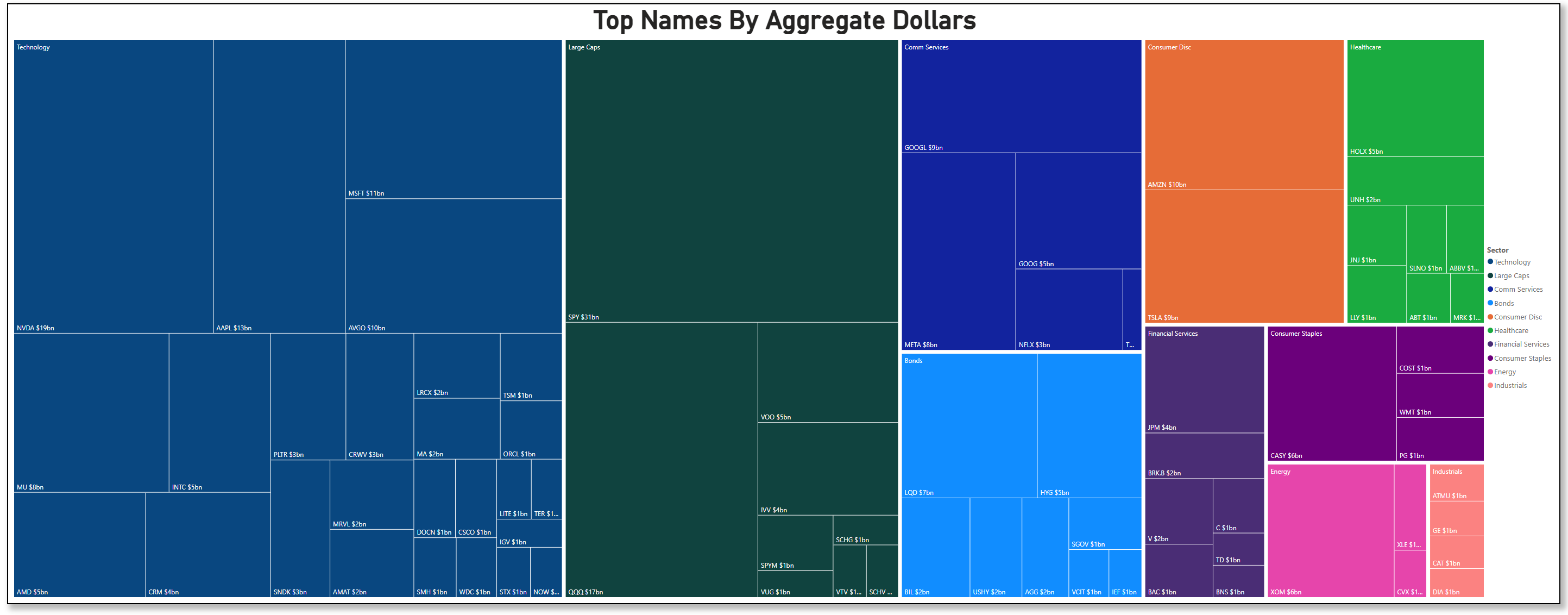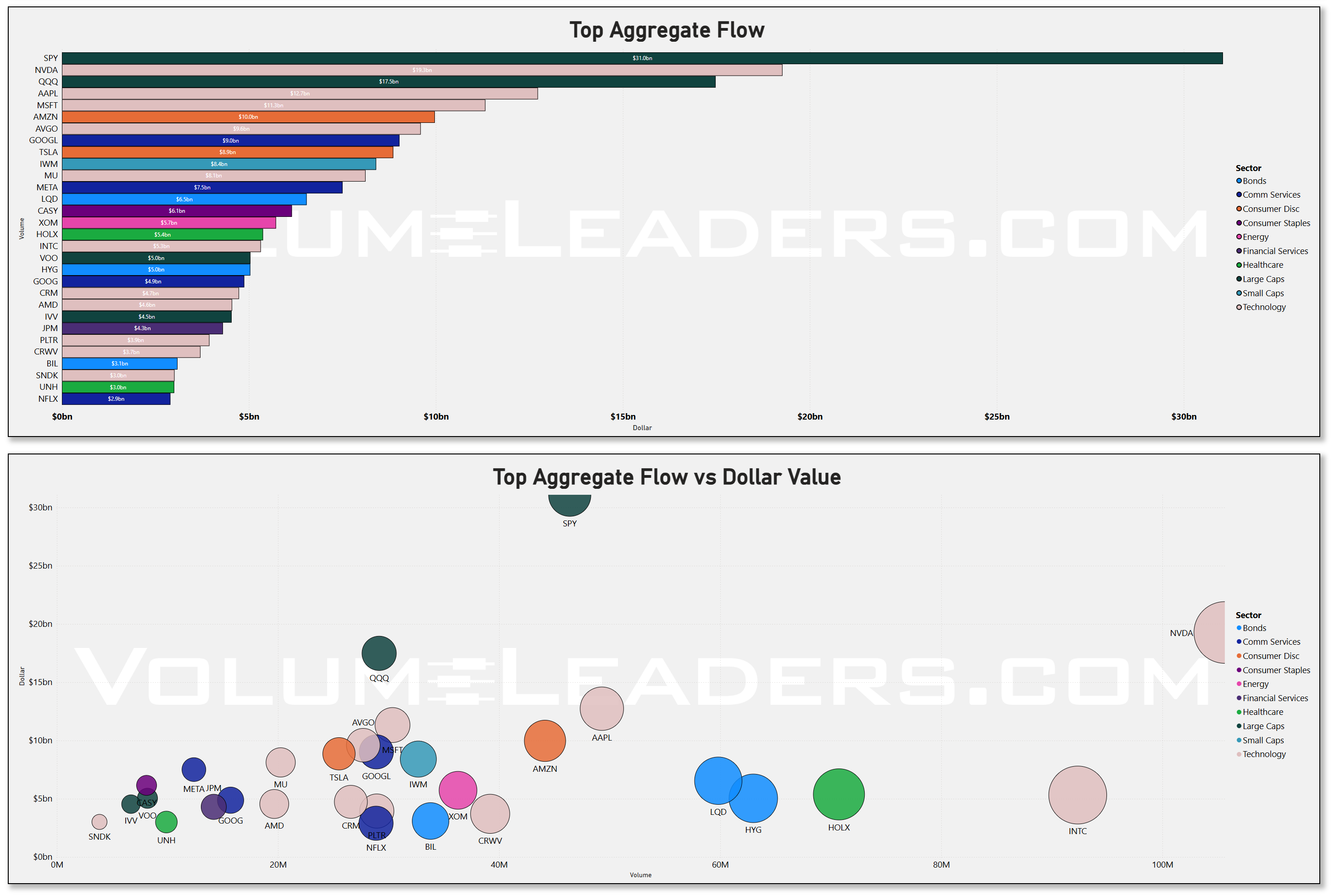 The aggregate flow rankings make the hierarchy explicit. SPY led all names at roughly $31 billion in total institutional dollars for the week, a figure that on its own reflects the index-level repositioning that comes with a macro regime shift. But the more interesting signal is the degree to which NVDA at approximately $19 billion and QQQ at $17 billion ran in tandem with SPY, clustering at the top in a configuration that speaks to broad program-driven repositioning and a lack of concentrated single-name conviction. AAPL at $13 billion, AVGO at $10 billion, AMZN at $10 billion, and MSFT at $11 billion filled out the megacap technology footprint, while the Comm Services complex showed up through GOOGL at $9 billion, GOOG at $5 billion, and META at $8 billion.