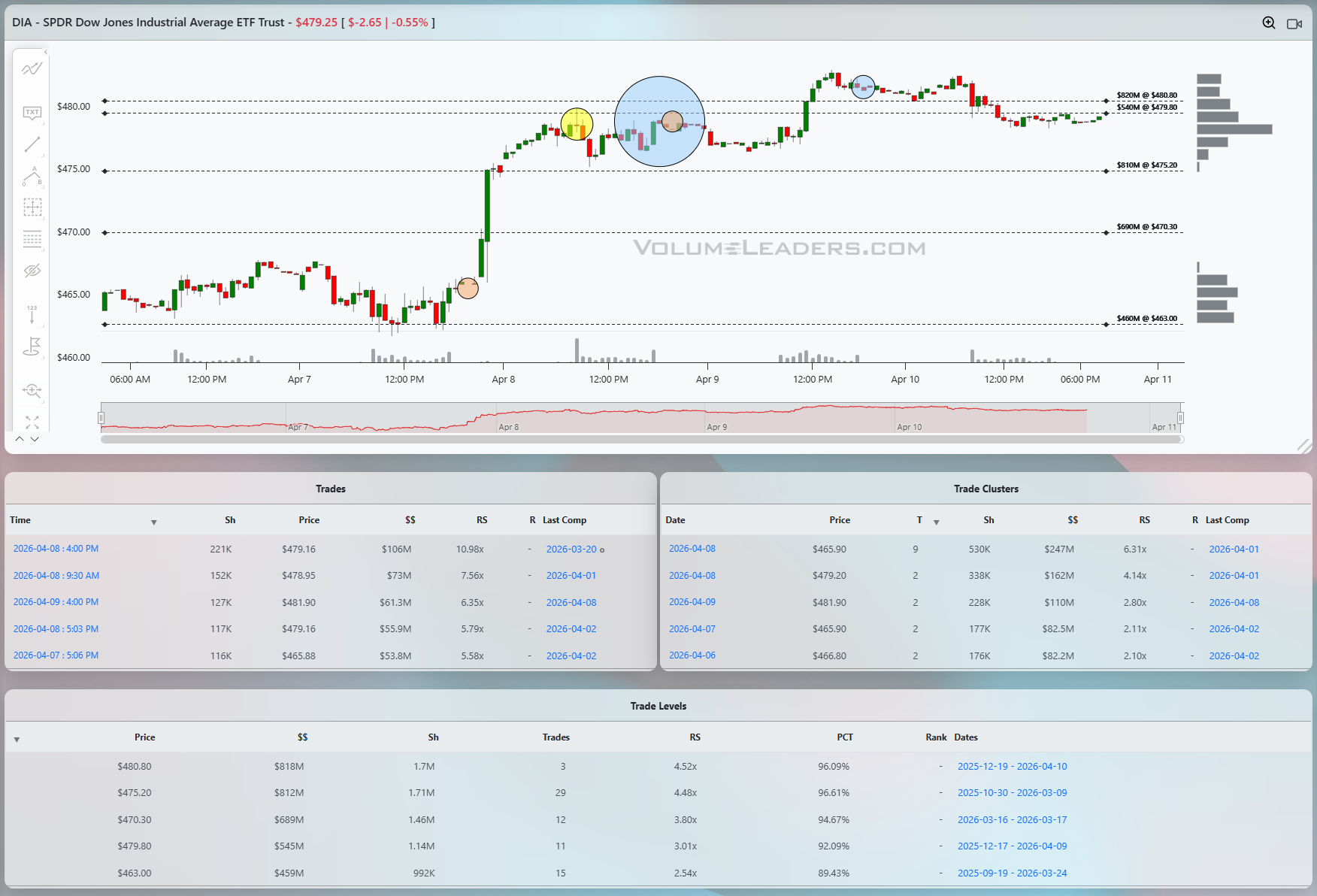DIA is the quietest of the four. The $480.80 level at $818 million and the $475.20 level at $812 million are closely spaced and both sit at the 96% PCT range, defining a compression zone between $475 and $481. Price at $479.25 is right in the middle of it. The $106 million April 8 close print at $479.16 with a 10.98x relative size is meaningful for DIA but modest compared to the institutional activity in SPY and QQQ -- the Dow complex is not where the big money has been concentrating. The cluster at $465.90 carrying $247 million is the gap fill reference below. The $481.90 cluster and the $480.80 level define the immediate upside resistance; a clean close above $481 would be constructive, but DIA is a follower here, not a leader.