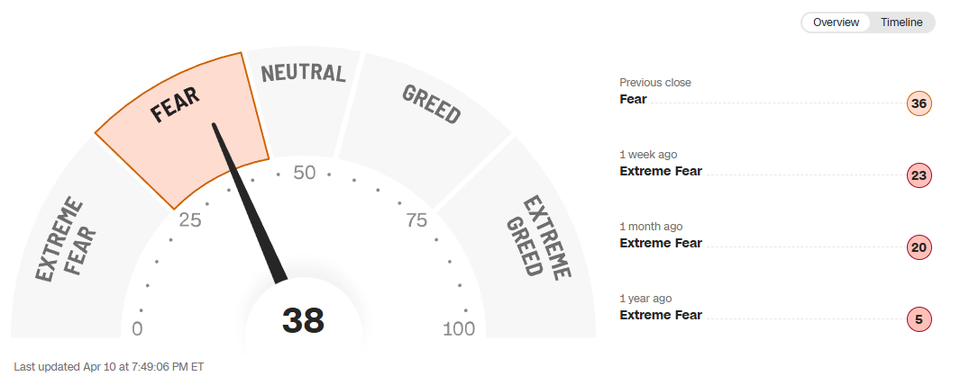 The CNN Fear and Greed Index posted a composite reading of 38 on April 10, labeled Fear, up from 36 at the previous close and a notable improvement from the Extreme Fear print of 23 just one week ago. One month ago the gauge sat at 20, also Extreme Fear, and the one-year-ago reading was a remarkable 5 -- near the absolute floor of the zero-to-100 scale -- marking the panic low from last spring's dislocation. The one-year trajectory is one of gradual regime repair: the index has crawled from deep capitulation toward low-end Fear, but has not yet approached Neutral at 50, let alone Greed territory.