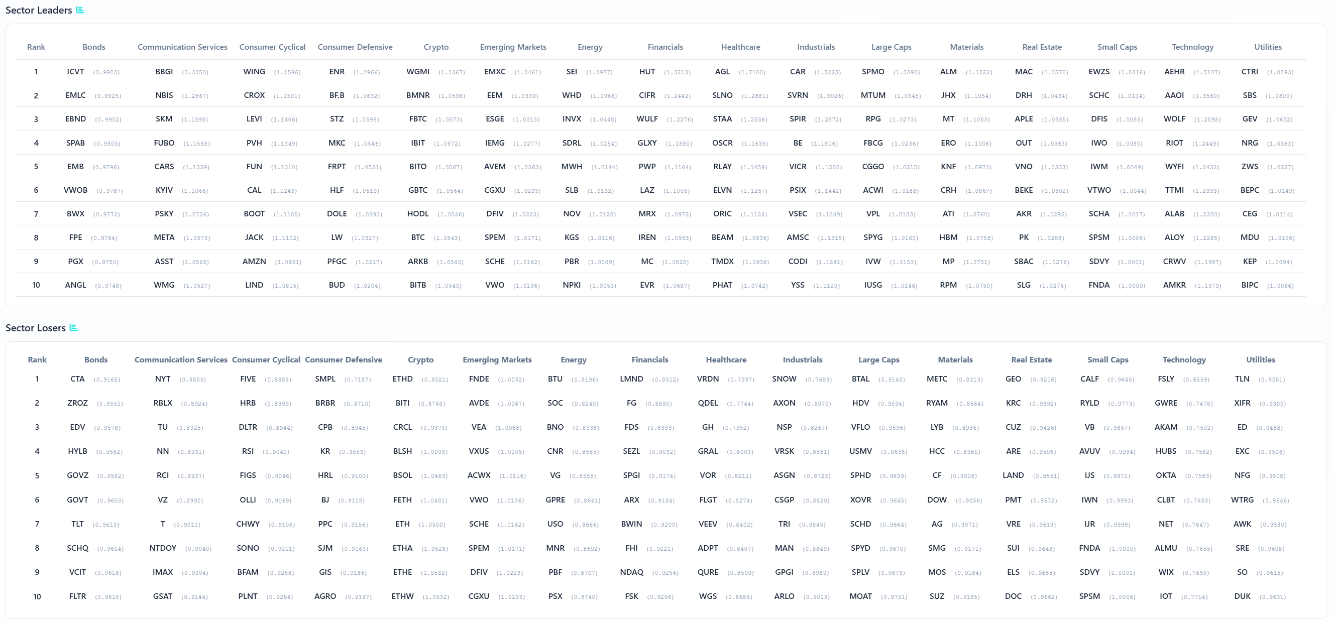 The sector losers column is equally informative as a risk management frame. SNOW leading technology losers at 0.7478 is a clean data point: despite the broad technology dollar flows, cloud software was not participating in the leadership. Energy losers -- BTU, SOC, BNO, CNR, USO, MNR, PBF, PSX -- are almost entirely commodity-price-linked rather than infrastructure names, consistent with the view that the ceasefire deflated the crude premium and punished names with the most direct oil price beta. The presence of FNDA and SPSM in both the real estate and small caps loser columns on the same week they appeared in the leader columns in other categories reflects the cross-sectional dispersion that a volatile, catalyst-driven week produces: the same vehicles can lead in one context and lag in another depending on factor exposure and timing.