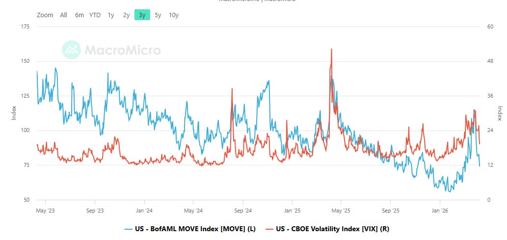 The pattern of MOVE normalizing rapidly while VIX remains sticky tells you bond-market stress has resolved -- likely via policy clarification or liquidity support -- but equity participants have not yet absorbed that message. Historically, when MOVE leads to the downside and VIX follows with a lag, equities tend to stabilize. The tripwire is a MOVE re-acceleration back above 120 with a sleepy VIX, which would signal a new Treasury dislocation the equity market has not priced. On the VIX side, a clean break below 17 would confirm the equity fear premium is draining and risk-on conditions are reasserting.