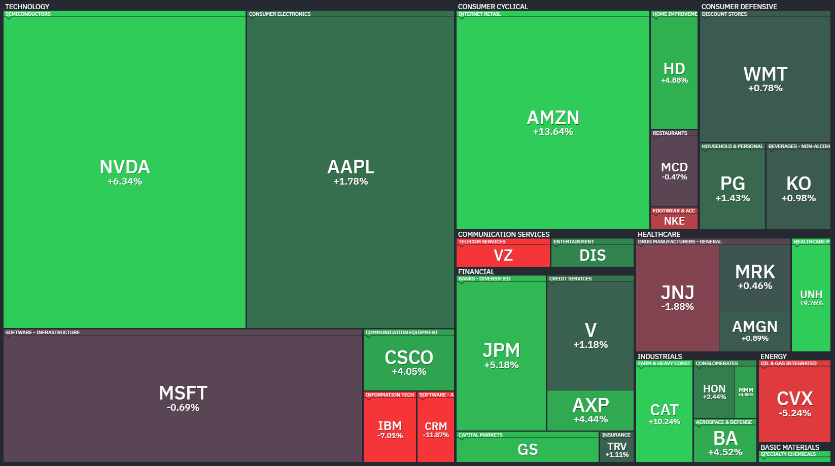 IBM’s -7.01% week was the headline casualty in the blue-chip heatmap, while AMZN (+13.64%) and JPM (+5.18%) carried the index. The NH-NL differential was +3 on the 5-day and flat (0) at every longer window. The Dow is neither confirming nor denying the rally; it is simply tagging along.