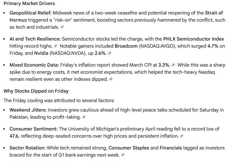 Th week delivered the kind of trading action that compresses months of narrative into five sessions: a geopolitical resolution that sent equities surging and oil cratering, an inflation print that confirmed the war’s economic cost, and a growing divergence between what markets are pricing and what the macro data is actually saying. The S&P 500 gained +3.56% for the week to close at 6,816.89, the Nasdaq Composite added +4.68% to 22,902.90, and the Dow Jones Industrial Average rose +3.03% to 47,916.57. It was the second consecutive week of solid gains, and for the first time since late January, the S&P 500 is within striking distance of breakeven on the year, sitting at -0.42% YTD. But the optimism layered into these prices deserves scrutiny, because the ceasefire that drove the week’s gains remains unverified on the ground, the inflation damage is only beginning to register in the data, and the consumer is in worse shape than the headline index levels suggest.