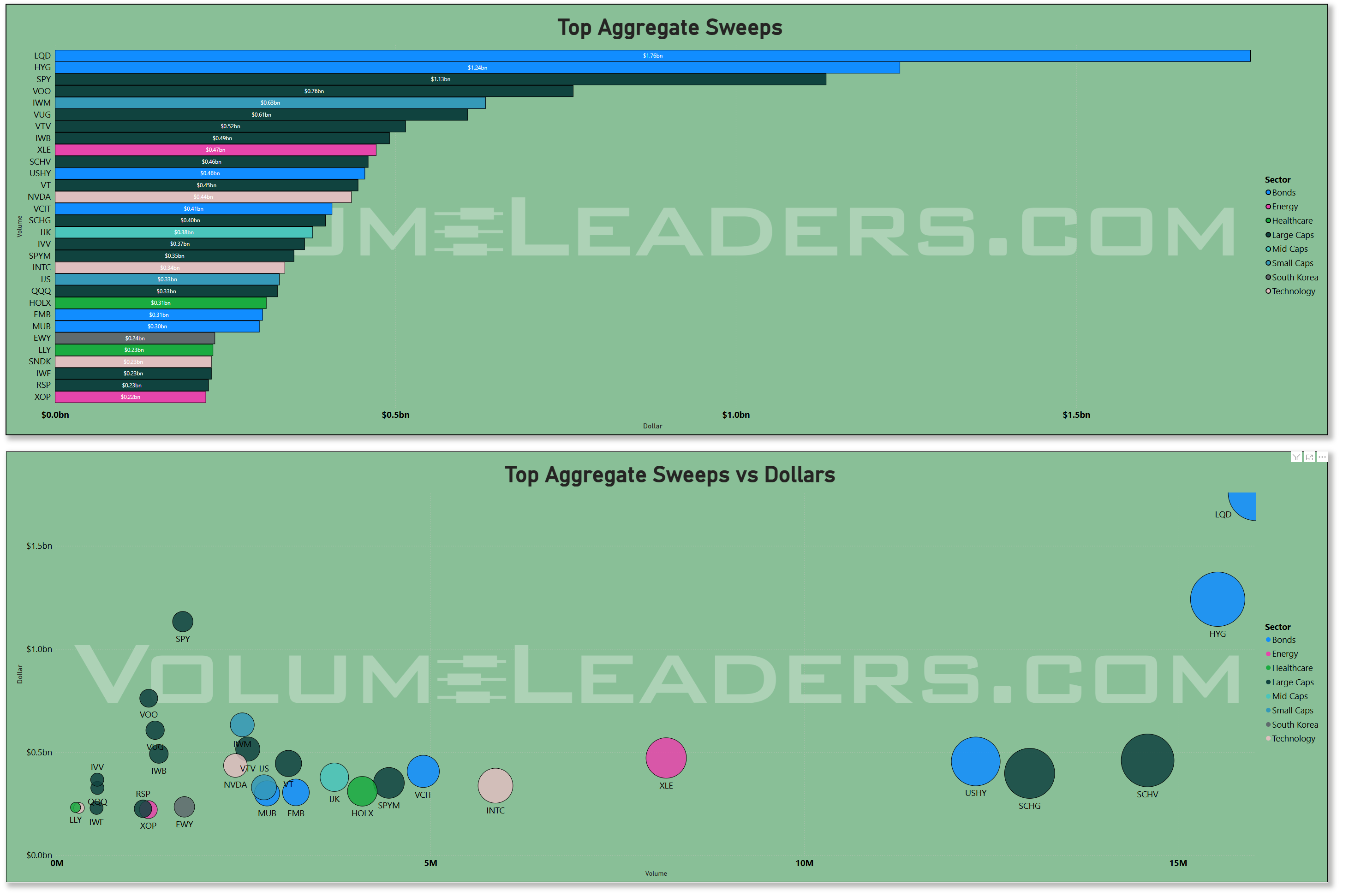 The sweep activity tells the most tactically direct story. LQD at $1.76 billion in sweeps was the largest single instrument swept this week by a significant margin, and HYG at $1.24 billion was second. The presence of credit ETFs at the very top of the sweep ladder -- above SPY at $1.1 billion -- is not a routine occurrence. Sweeps by definition reflect urgency: market participants who are willing to pay through multiple price levels to build a position immediately. When fixed income ETFs generate that kind of urgency, it almost always reflects either a rapid de-risking event or, as appears to be the case here, an aggressive positioning move driven by a macro catalyst -- in this case the ceasefire-driven credit spread compression and the simultaneous relief in the oil market on April 7th. The equity sweep activity was heavily concentrated in passive vehicles: VOO, IWM, VUG, VTV, IWB, and XLE all appearing in the top tier, with XLE’s $0.47 billion in sweeps representing a tactical energy positioning bet that should be monitored closely. SCHV and USHY showing up in the high-volume, moderate-dollar quadrant of the sweep scatter indicates that institutions were also chasing value and high-yield income exposure at speed, consistent with a risk-recovery playbook rather than defensive rotation.