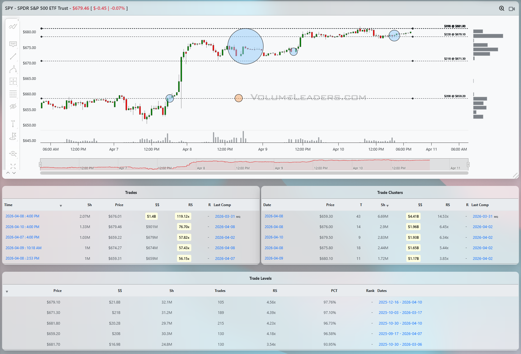 SPY delivered the week's cleanest institutional footprint. The April 8 ceasefire impulse drove price from the $659 area to the $680 region in a single vertical session, and the tape at the low end of that move was not subtle. A $1.4 billion print at $676.01 on April 8 at 4:00 PM with a relative size of 119.12x stands as the dominant institutional statement of the week -- one of the largest dollar prints in SPY's history on a day-to-day basis. That print landed at the close of the ceasefire surge session, and the cluster underneath it at $659.30 carrying $4.41 billion across 43 trades is the most important level on the entire chart. That cluster is the foundation. It is where the accumulation that preceded the impulse was built, and the $659.20 trade level at $20 billion notional with a 96.58% PCT confirms this area has been contested by serious capital over a long date range. Below $659, there is no comparable support within the visible structure. A return to that zone without a macro catalyst deterioration would be the most well-defined re-entry on the book.