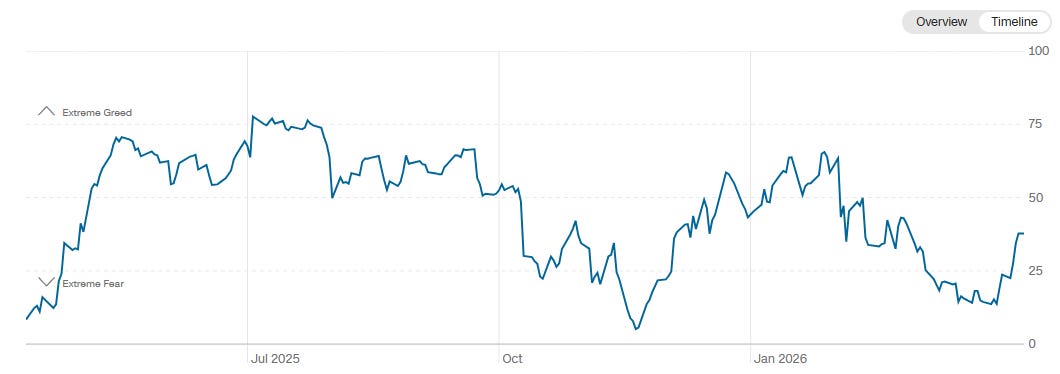 A reading of 38 keeps the index in contrarian-supportive territory -- there is enough pessimism baked into positioning that positive surprises get amplified, while negative surprises meet a market that has already de-risked. The tripwire on the upside is a push through 55 into Greed, which would indicate the easy contrarian edge has been spent and the market is no longer offering a fear discount. On the downside, a retreat back below 20 would signal the recovery attempt has failed and a deeper capitulation cycle is underway.