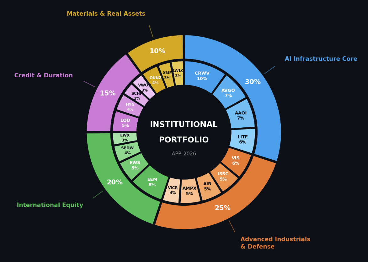 The simultaneous outlier prints in EWS, EWL, EWI, EWP, SPDW, and EWX on April 10th, combined with the emerging markets participation rate above 93% and the cleanest positive relative strength trend of any sector data, make the international allocation sleeve the most macro-driven component of the portfolio. The ceasefire removed a geopolitical overlay that had been suppressing international equity appetite, and the institutional response on Friday was rapid and broad-based. This sleeve is built with a tilt toward the specific geographies that printed outlier readings, balanced with the broad EM vehicle that confirmed the theme across the TRV and backdrop data.