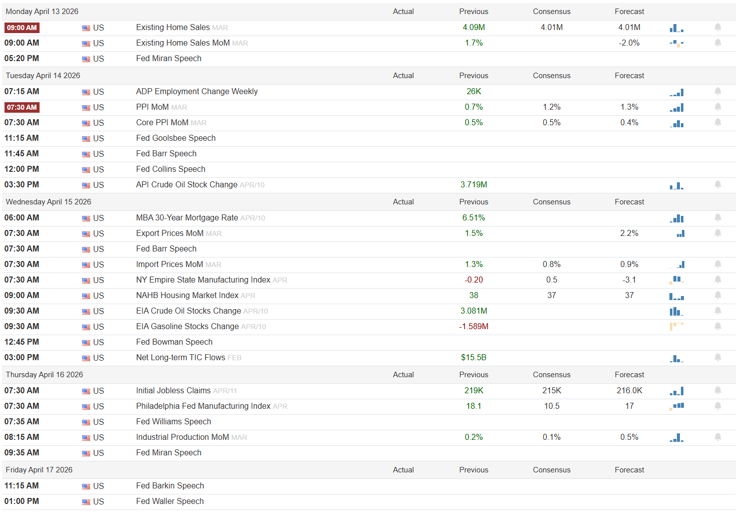 Tuesday is the week’s first high-stakes session. PPI MoM for March carries a previous reading of 0.7%, consensus at 1.2%, and forecast at 1.3%. Core PPI MoM shows a previous of 0.5%, consensus of 0.5%, and forecast of 0.4%. The risk-off scenario is a headline PPI that meets or exceeds the 1.3% forecast while core softens toward 0.4%, a split that would suggest pipeline price pressure is building in goods while services moderate -- an uncomfortable combination for the Fed. Risk-on would be headline below 0.7% with core in line, opening the door to rate-cut repricing. Three Fed speakers -- Goolsbee, Barr, and Collins -- crowd the mid-day calendar, and with PPI fresh, any acknowledgment that goods inflation is re-accelerating on tariff pass-through would harden the higher-for-longer read. API Crude Oil Stock Change, previously 3.719 million barrels, closes the session; a large build would soften energy-sector momentum.