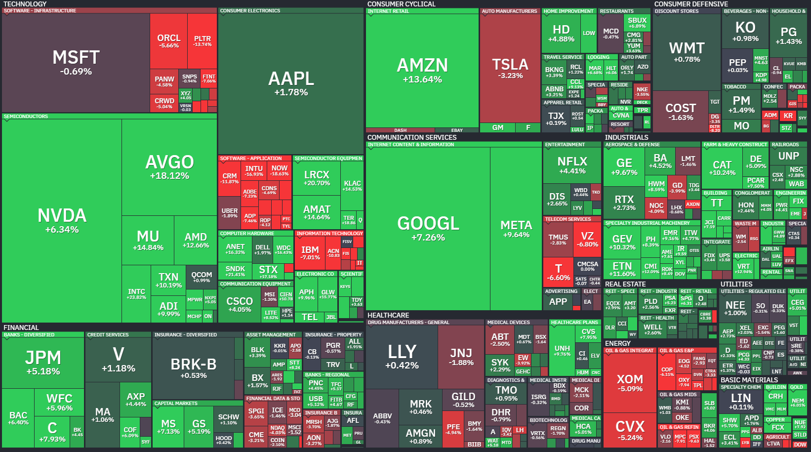 The NH-NL spread is barely positive on the 5-day (+4) and 1-month (+6) windows, and negative at every lookback from 3-months out. The heatmap partially masks this: AVGO’s +18.12% week, AMZN at +13.64%, MU at +14.84%, and GOOGL at +7.26% generated outsized cap-weight returns, but MSFT was essentially flat (-0.69%), AAPL contributed just +1.78%, and names like PLTR (-13.74%), PANW (-4.58%), and CRWD (-5.04%) dragged the software infrastructure cohort lower. The semis saved the NDX this week; software did not.