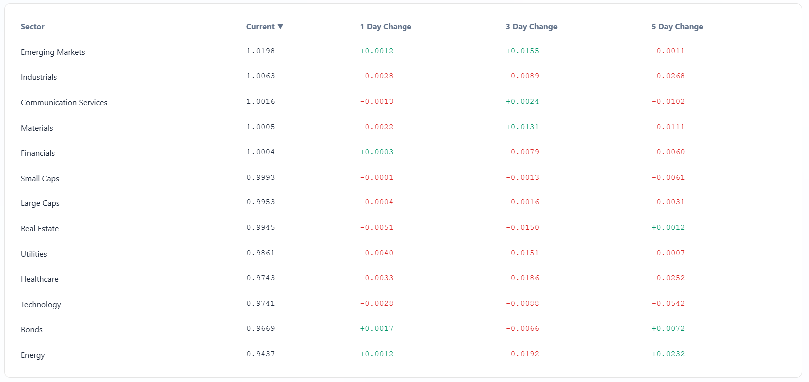 Emerging markets leadership through EMXC, EEM, ESGE, IEMG, AVEM, SPEM, CGXU, DFIV, SCHE, and VWO is essentially a who’s-who of international equity exposure vehicles, and every one of them registering leadership ratios above 1.02 on the same week that EWS, EWL, EWI, and SPDW printed outlier sigma readings creates a closed loop: the international allocation thesis visible in the IO list is confirmed by price leadership in the EM column. The participation rate above 93% for emerging markets in the backdrop data, the outlier ETF prints, and now sector leadership ratios all pointing the same direction is about as clean a multi-lens confirmation as the data can produce.